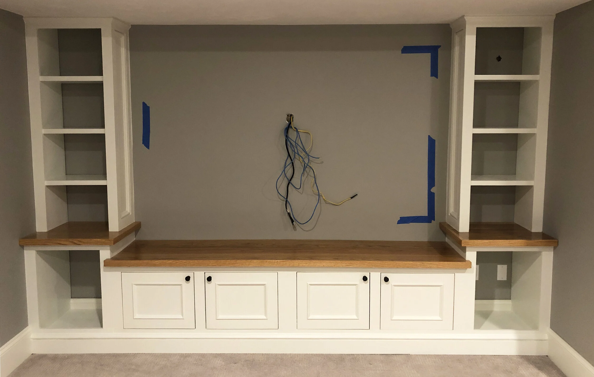 Custom cabinets and shelving, including an oak top finished to exactly match the client's floor