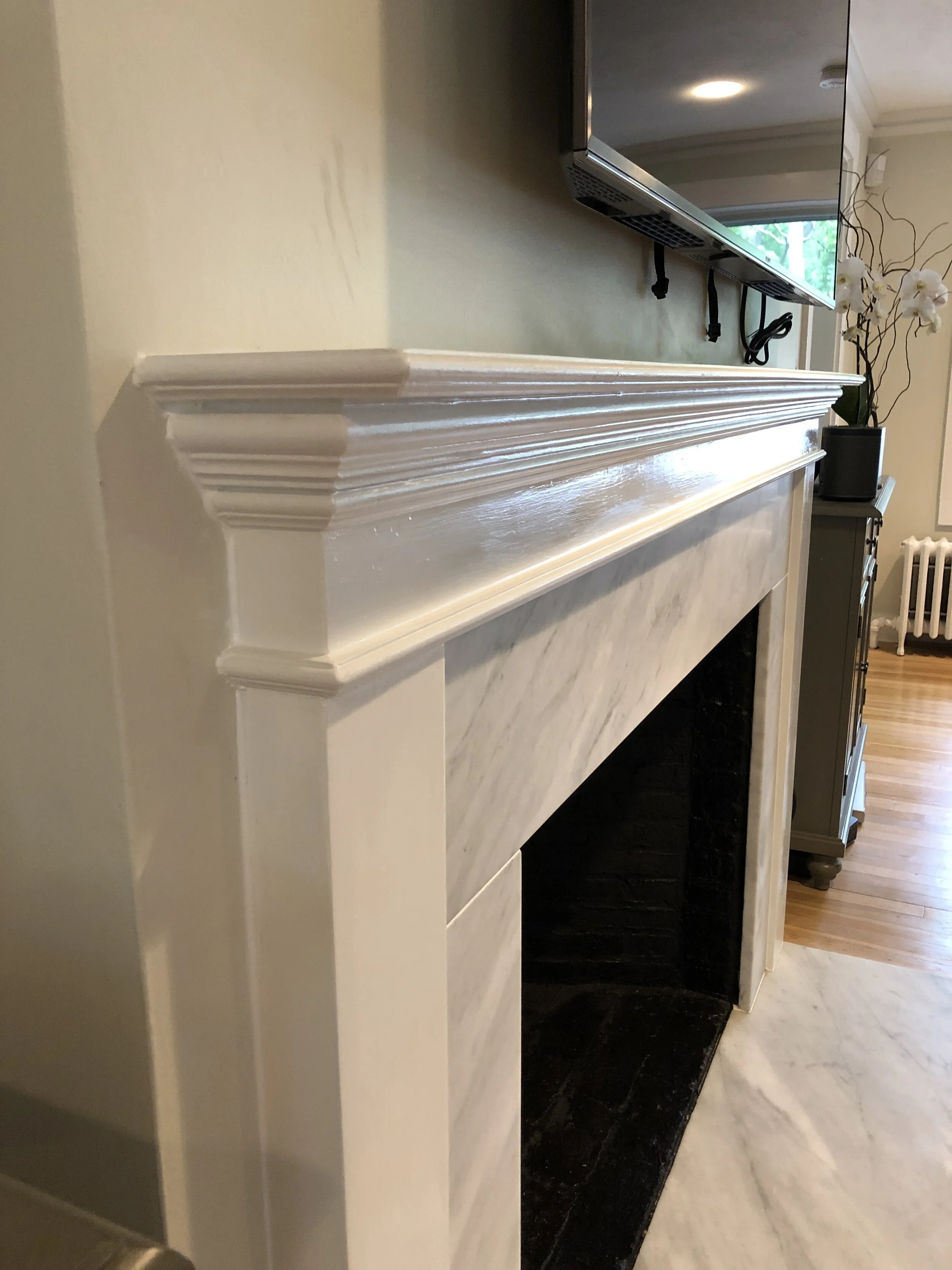 A custom fireplace mantle designed to complement the original molding and style of the client's historic home